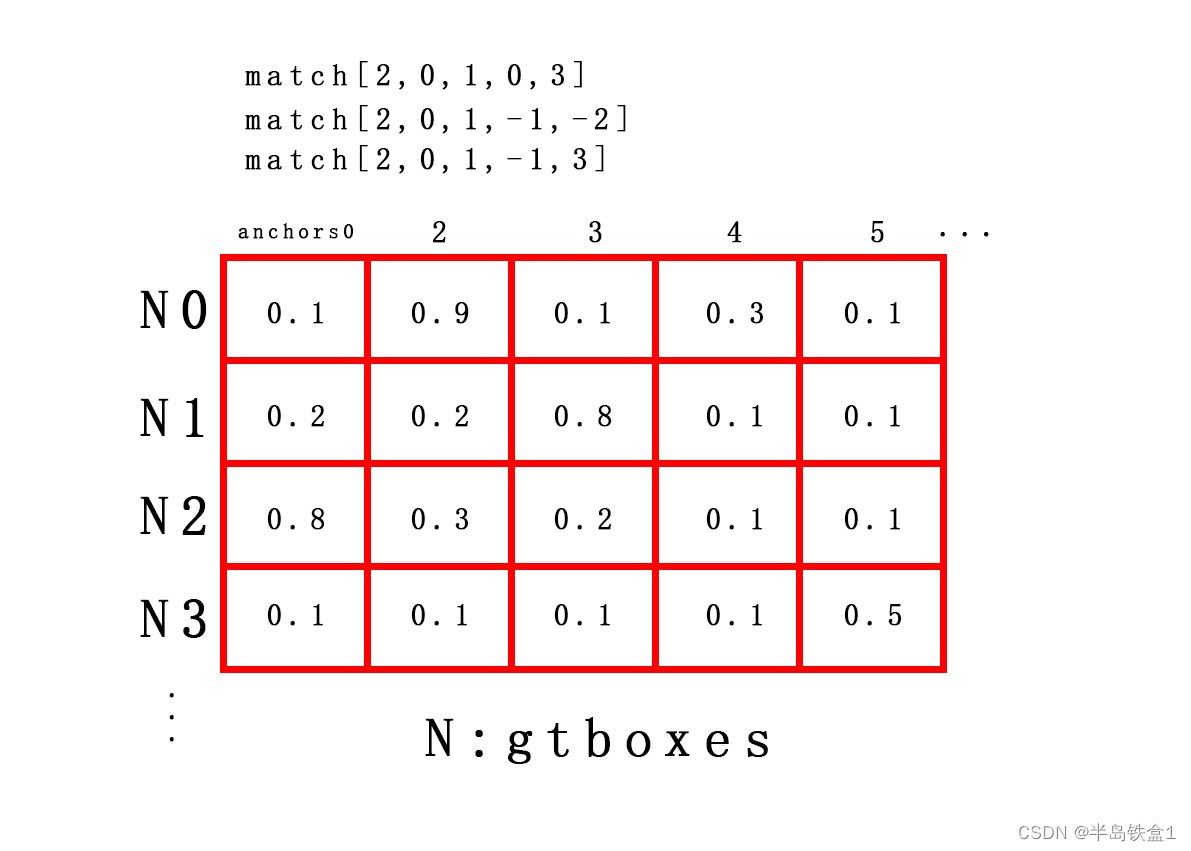 如下图每一个anchors与对应boxes之间的iou都会被计算,然后先挑选出每一个anchors最匹配的boxes作为正样本,如第一个match所示,然后对其进行调整iou<0.3的索引调为-1,0.3<iou<0.7的索引调为-2如第二个match所示,但是如果有一个box自始至终都没有被匹配到的话像N3,那么也把N3对应anchors最大的值设为正样本如下图第三个match所示