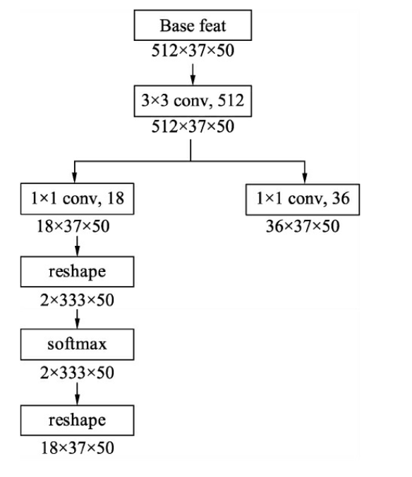 VGG特征提取后的feature map输入到RPN网络,左侧为分类网络分支,右侧为回归网络分支。特征图输进来之后,最终输出的是对该点处的9个Anchor的类别的预测(前景、背景,9x2=18,分别为前景的概率,背景的概率)和对该9个Anchor的4个偏移量预测(9x4=36)