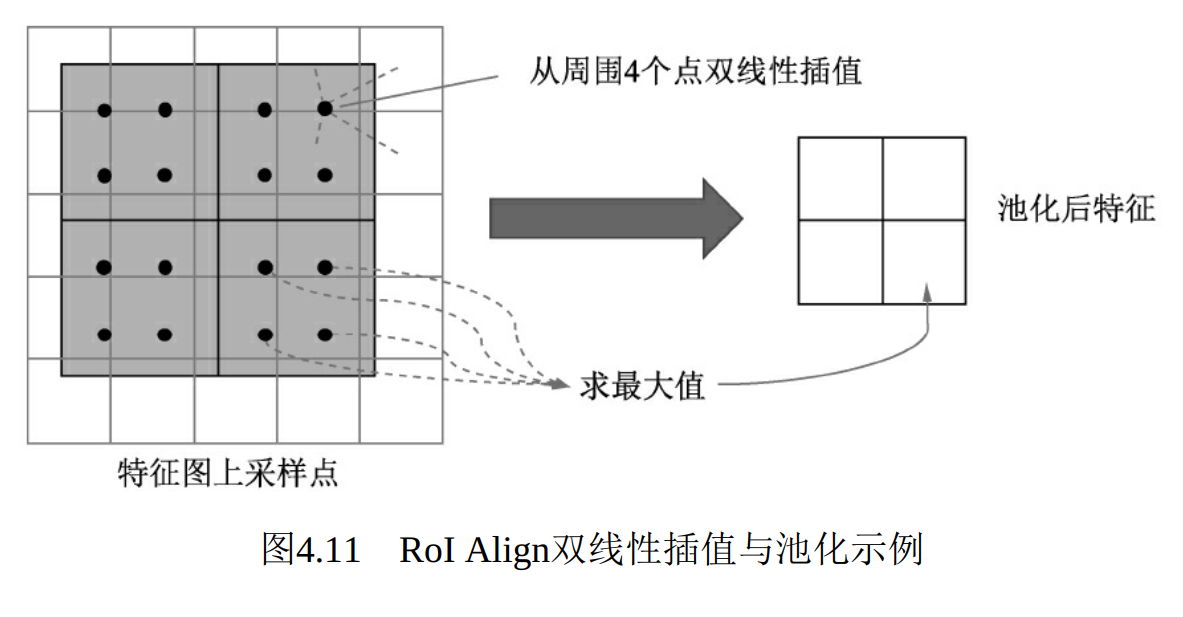 定义一个2x2的方格,每个方格内部再定义四个小方格,每个方格的中心作为黑点位置,可以理解为取值位置,用该框遍历特征图,选取四个点处的值最大的为池化后的值。