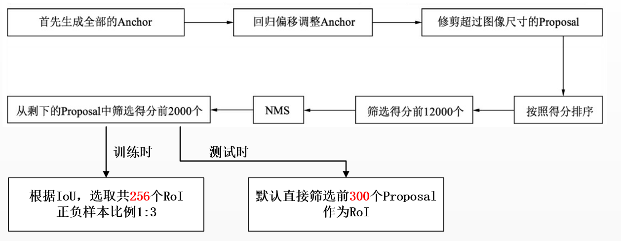 此处不好理解的是损失计算和生成proposal有什么关系,确实没有直接关系~,损失可以理解为训练过程中用到的概念,生成proposal可以理解为验证识别的过程中用到的概念。经过RPN网络的识别调整后会有很多(大于12000个)anchors,这时候进行修剪超尺寸的、按得分排序选12000个,再经NMS筛选,再排序选2000个,排序都是根据RPN网络中的分类网络的预测得分选择。