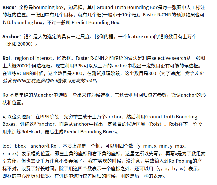 loc: bbox,anchor和RoI,本质上都是一个框,可以用四个数(y_min, x_min, y_max, x_max)表示框的位置,即左上角的座标和右下角的座标。这里之所以先写y,再写x是为了数组索引方便,但也需要千万注意不要弄混了。 我在实现的时候,没注意,导致输入到RoIPooling的座标不对,浪费了好长时间。除了用这四个数表示一个座标之外,还可以用(y,x,h,w)表示,即框的中心座标和长宽。在训练中进行位置回归的时候,用的是后一种的表示。