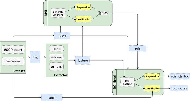 其中AnchorTargetCreator和ProposalTargetCreator是为了生成训练的目标,只在训练阶段用到,ProposalCreator是RPN为Fast R-CNN生成RoIs,在训练和测试阶段都会用到。三个共同点在于他们都不需要考虑反向传播(因此不同框架间可以共享numpy实现)