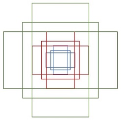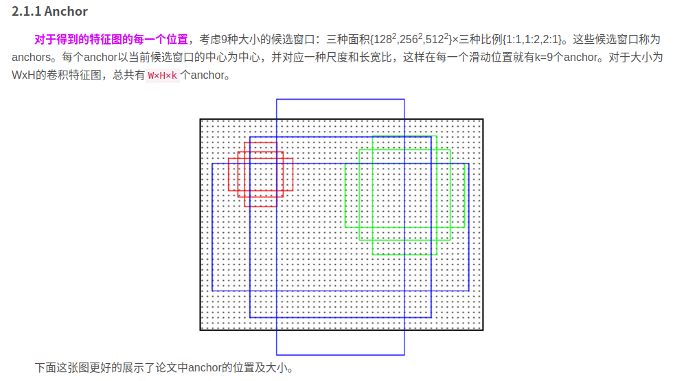 在RPN中,作者提出了anchor。Anchor是大小和尺寸固定的候选框。论文中用到的anchor有三种尺寸和三种比例,如下图所示,三种尺寸分别是小(蓝128)中(红256)大(绿512),三个比例分别是1:1,1:2,2:1。3×3的组合总共有9种anchor。