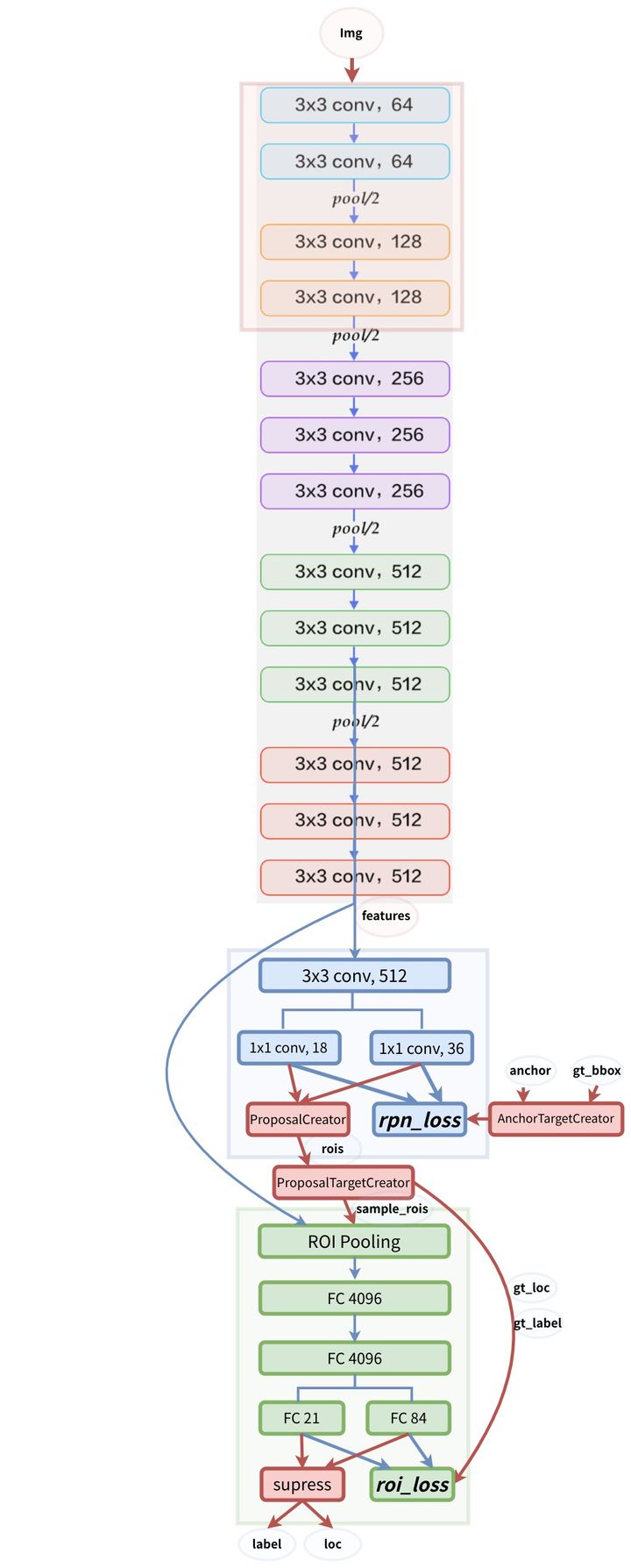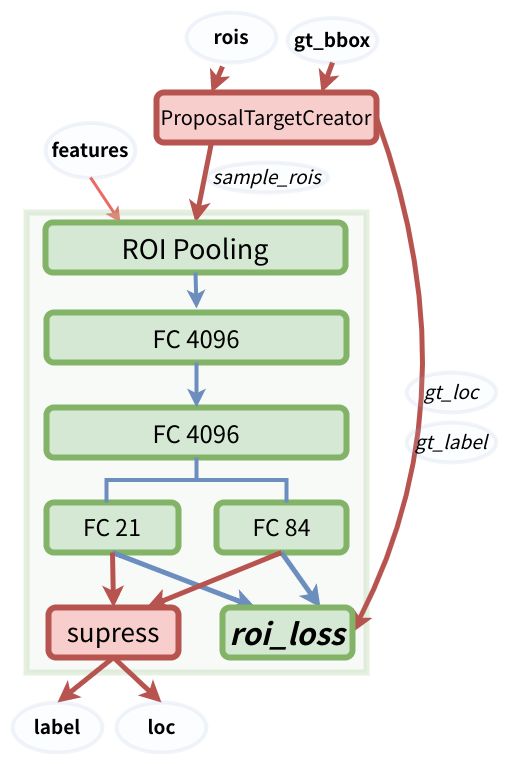 需要注意的是: 蓝色箭头的线代表着计算图,梯度反向传播会经过。而红色部分的线不需要进行反向传播(论文了中提到了ProposalCreator生成RoIs的过程也能进行反向传播,但需要专门的算法)。