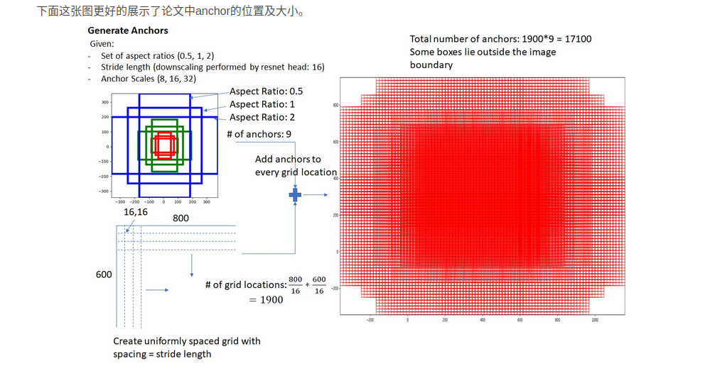 然后用这9种anchor在特征图(feature)左右上下移动,每一个特征图上的点都有9个anchor,最终生成了 (H/16)× (W/16)×9个anchor. 对于一个512×62×37的feature map,有 62×37×9~ 20000个anchor。 也就是对一张图片,有20000个左右的anchor。这种做法很像是暴力穷举,20000多个anchor,哪怕是蒙也能够把绝大多数的ground truth bounding boxes蒙中。