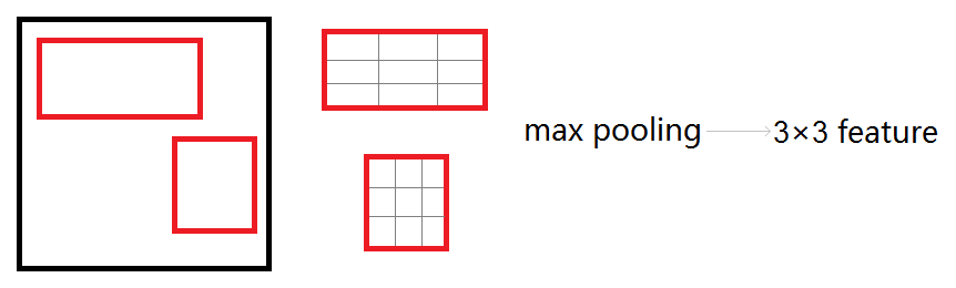 由于RoIs给出的2000个候选框,分别对应feature map不同大小的区域。首先利用ProposalTargetCreator 挑选出128个sample_rois, 然后使用了RoIPooling 将这些不同尺寸的区域全部pooling到同一个尺度(7×7)上。下图就是一个例子,对于feature map上两个不同尺度的RoI,经过RoIPooling之后,最后得到了3×3的feature map.
