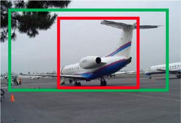 selective search选出的可能是红色的框,ground truth是绿色的框,判断是否正确是用IoU的值来判断,输出红色框会影响到结果判断,但是已经把飞机检测出来了只要对红色框做线性变换(缩放+平移),就可以了。[7]认为,CNN输出的特征向量里包含了信息,所以在CNN输出的特征向量上做了一个loss计算,调整原来框的位置(相当于对原来的框加上缩放和平移操作)。所以每一个种类都设计了边界框回归BoundingBox Regression,只要设计一个好的loss函数,能学习到一组参数使loss收敛就可以啊。因此,loss的设计是关键。对于BoundingBox Regression 回归的具体做法,会单独研究。