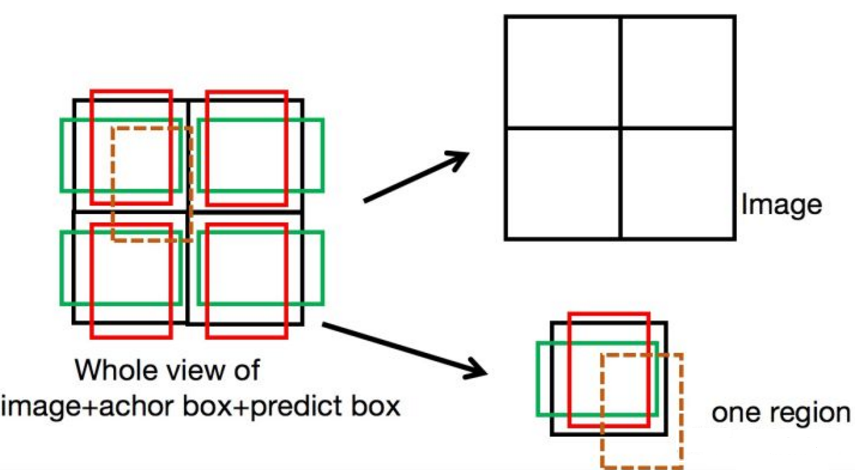 当模型输出的预测位置是棕色虚线框时,计算预测框和每一个锚点框的误差。方法是:首先用bounding box regression的方法计算每一个anchor box 到真值框的偏移量 t1,每一个scale的anchor box都需要bounding box regressor; 再计算预测框到每一个anchor box的偏移量 t2 , 最后使回归损失L1(t1-t2)最小。