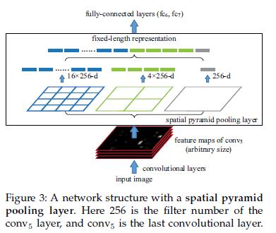 如果原图输入是224x224,对于conv5出来后的输出,是13x13x256的,可以理解成有256个这样的filter,每个filter对应一张13x13的activation map.如果像上图那样将activation map pooling成4x4 2x2 1x1三张子图,做max pooling后,出来的特征就是固定长度的(16+4+1)x256那么多的维度了.如果原图的输入不是224x224,出来的特征依然是(16+4+1)x256;直觉地说,可以理解成将原来固定大小为(3x3)窗口的pool5改成了自适应窗口大小,窗口的大小和activation map成比例,保证了经过pooling后出来的feature的长度是一致的.