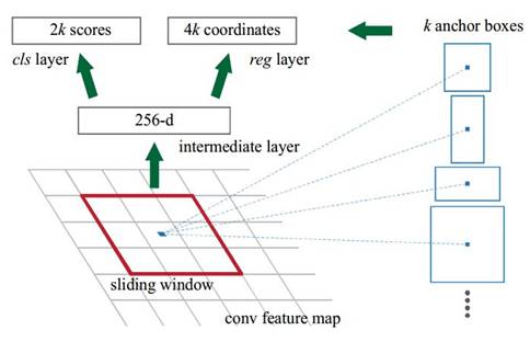 (2)cls-layer,用于判定该proposal是前景还是背景.sliding window的处理方式保证reg-layer和cls-layer关联了conv5-3的全部特征空间.事实上,作者用全连接层实现方式介绍RPN层实现容易帮助我们理解这一过程,但在实现时作者选用了卷积层实现全连接层的功能.