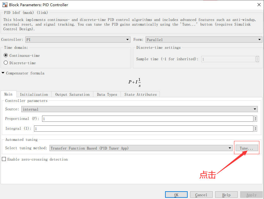 此时的波形就比较的振荡,不满足控制的要求,需药调节PID的控制参数,如果手动进行调节,需要花费大量的时间,有可能调节的参数不是最好的。这是可以使用PID Tuner App进行PI参数的自行调整。双击PID模块,点击Tune......,如图所示:
