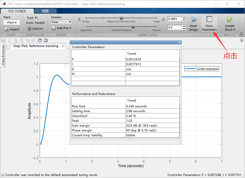 此时的参数已经默认调试完成,点击 Show parameters 来显示控制参数P和I以及一系列控制性能和健壮性的度量指标。