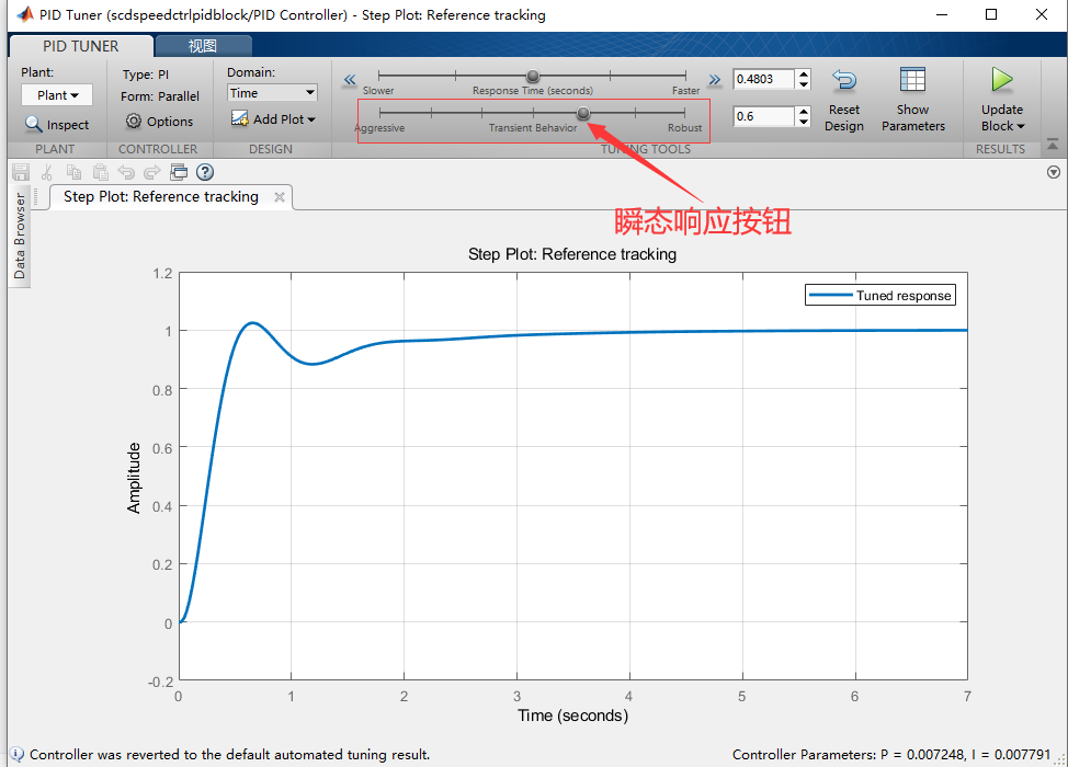 参考信号跟踪响应的超调大概为2.5%。因为在满足过渡时间要求的前提下还有一些余量,我们可以通过增加响应时间来减小超调。向左移动响应时间滑块来增加闭环系统的响应时间。注意在调整响应时间的时候,响应曲线和控制器参数以及性能指标也在不断更新。如图所示:
