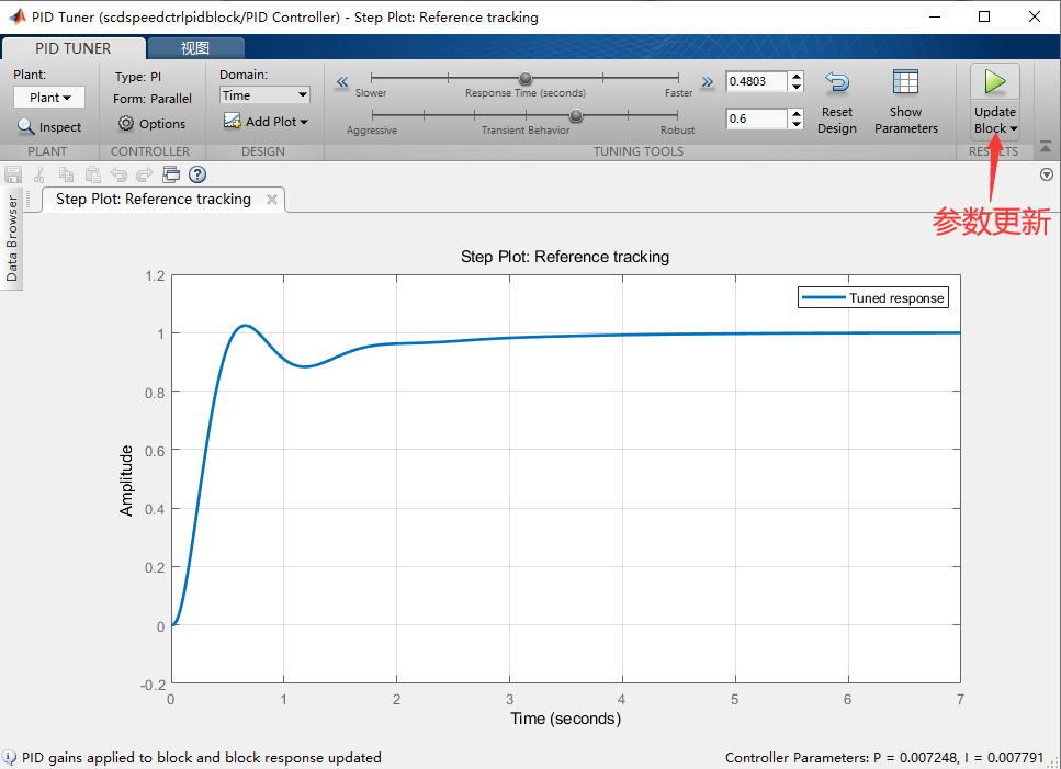 在经过线性近似的装置模型上得到性能满意的控制器之后,还需要在原来的非线性装置上进行检验。在PID Tuner中点击Update Block按钮,把调好的参数写入Simulink模型中的PID控制器。点击Update Block按钮,如图所示: