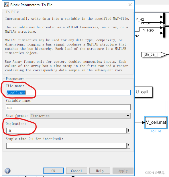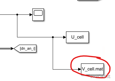然后,将该模块和需要采集的变量连接起来,并定义生成文件的文件名。下图中生成的文件名为V_cell.mat: