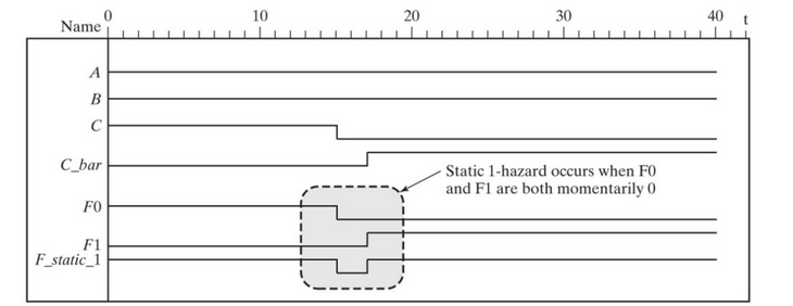 毛刺信号如下图影印部分所示,由于C经过一个非门才到达下面的与门,故F1相对于F0有延迟,那么在F端就会造成毛刺,这个毛刺就是有短暂的时间输出为0。