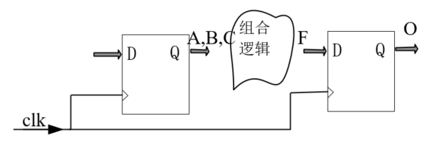 时序逻辑示意图,如下图所示。数据从一个寄存器出来,经过组合逻辑到达下一个寄存器。