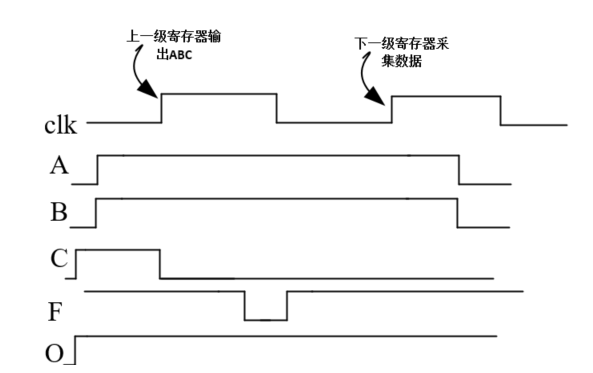 但是利用时序电路,数据A,B,C的触发是在时钟沿,输出信号F也是在时钟沿去采,而这个时钟沿到来的时间是在F输出稳定之后,故对电路的毛刺具有容忍度。如下图,可以看到最后寄存器的输出O就不存在毛刺。