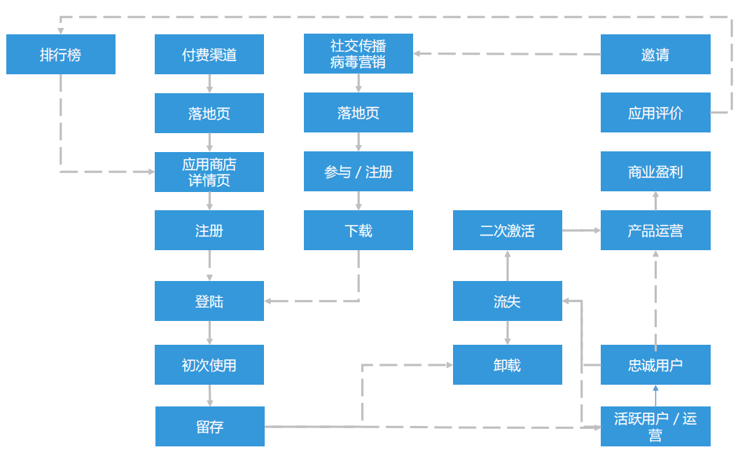 Acquisition 用户获取、Activation 用户活跃、Retention用户留存、Revenue 营收、Refer传播