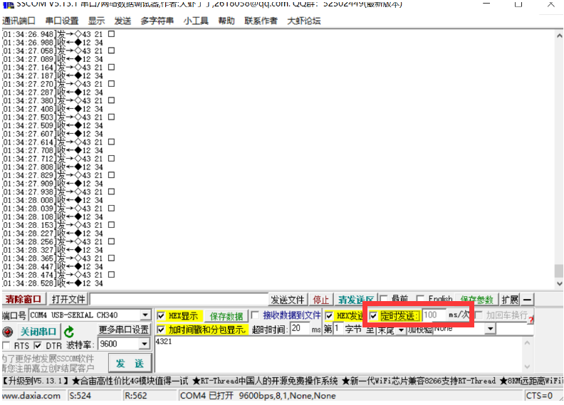 分别在PC端串口调试工具和蓝牙调试助手上设置好每包数据循环发送的时间间隔,观察互发互收的情况。