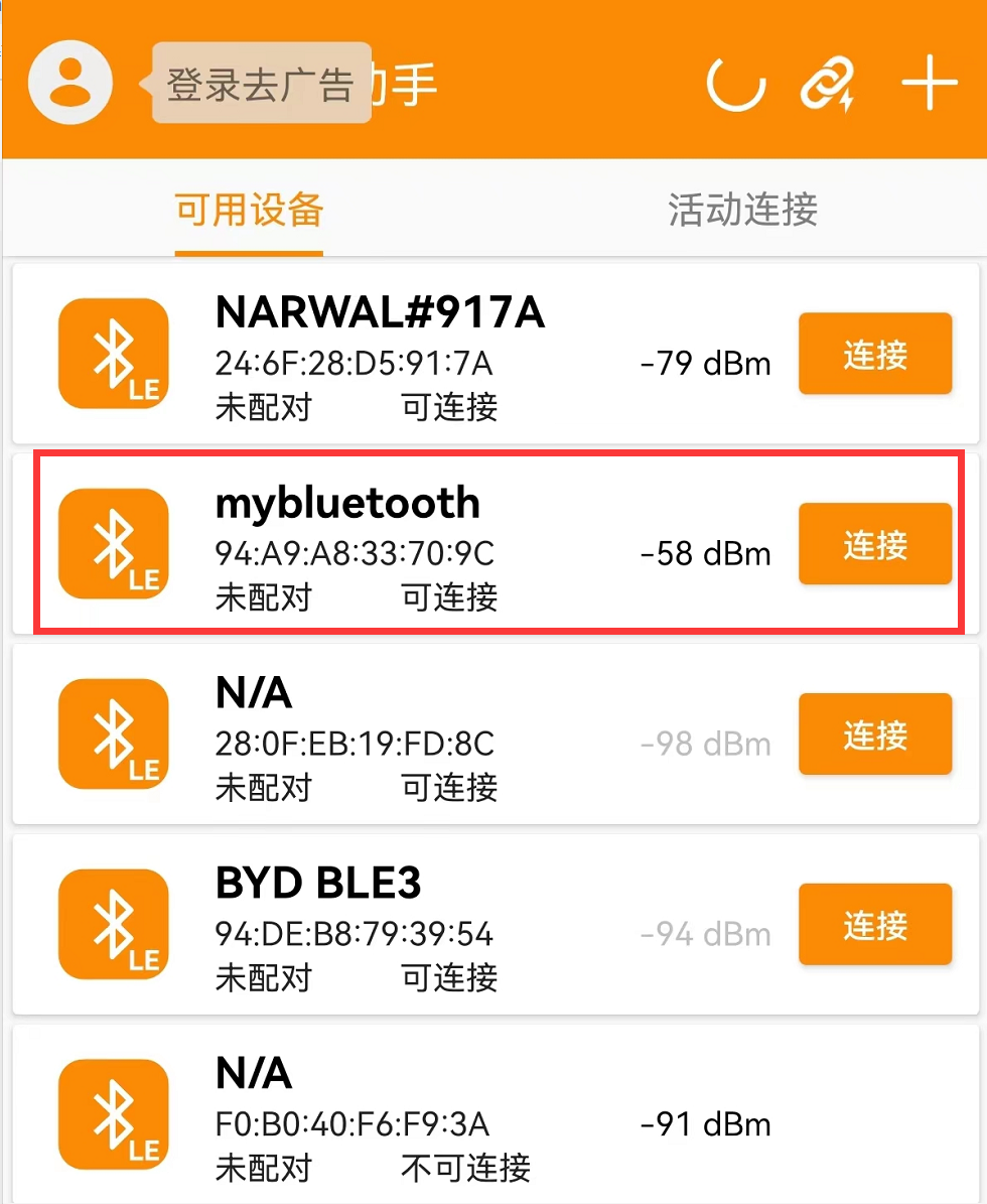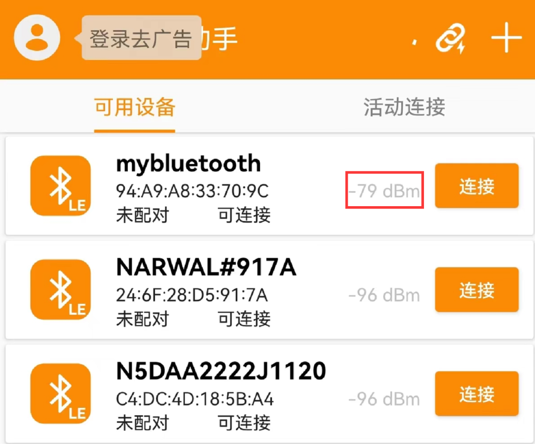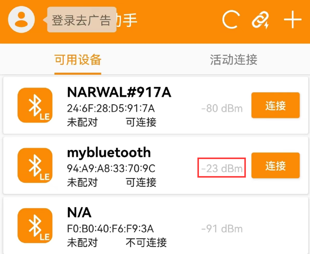 可以在蓝牙调试助手上看到扫描到的模块信号的强度,dbm 中文是分贝毫瓦,是一个表示无线功率的绝对值。它的数值是以1mw功率为基准的一个比值。计算公式如下:dbm=10log(p/1mw)