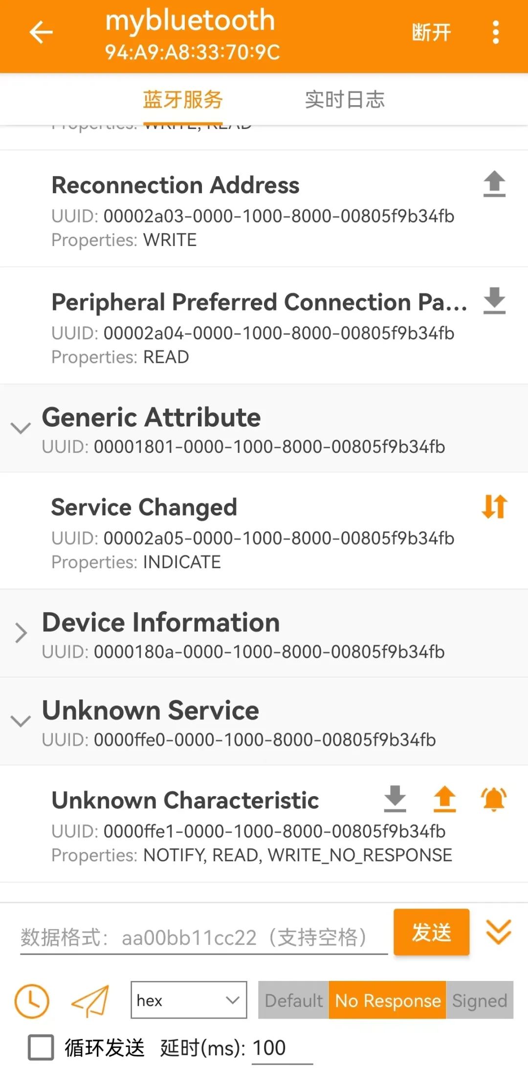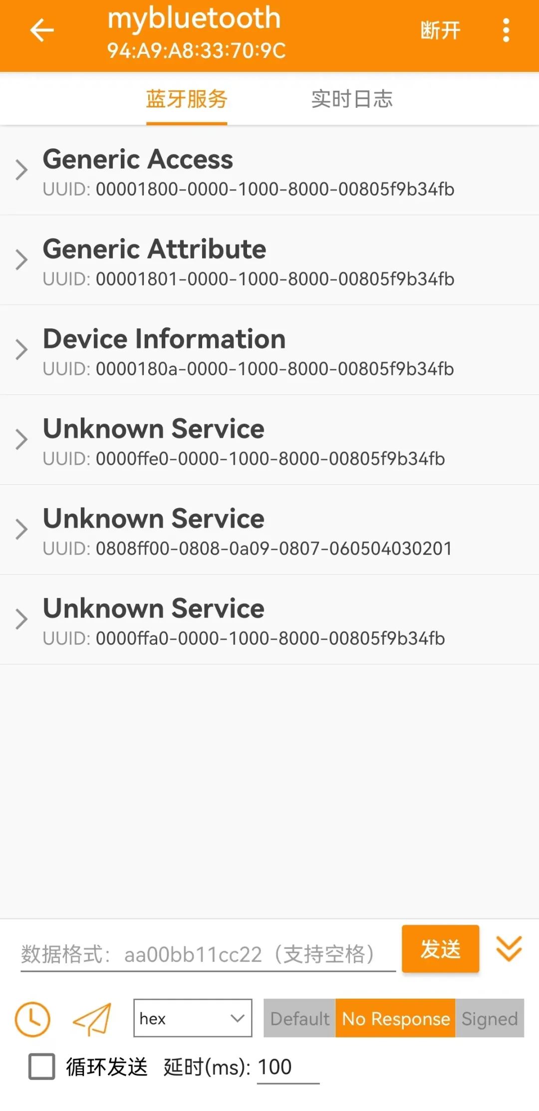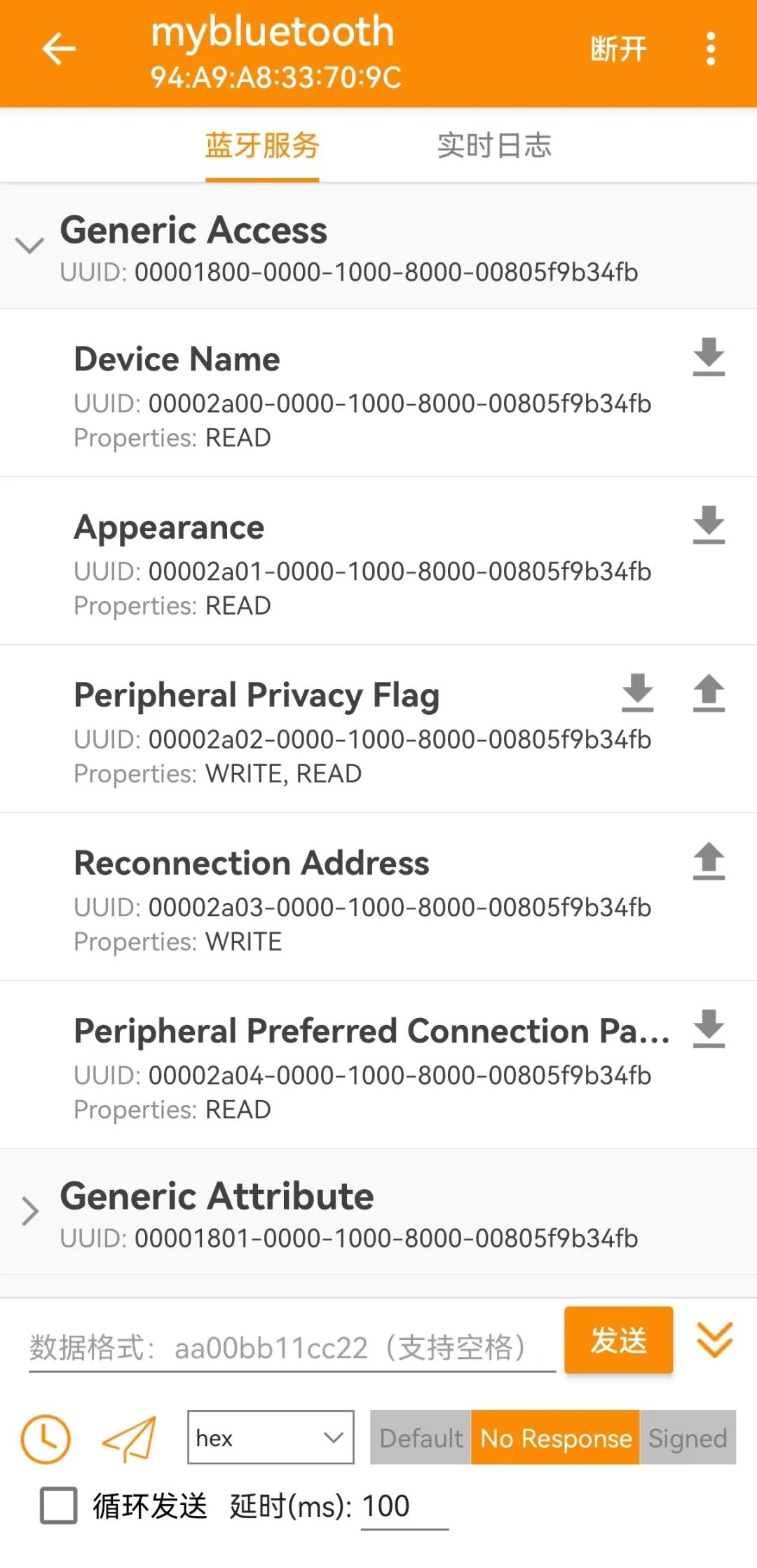 比如蓝牙连上之后,可以看到这几个蓝牙服务,Generic Access、Generic Attribute、Device Information以及Unknown Service。