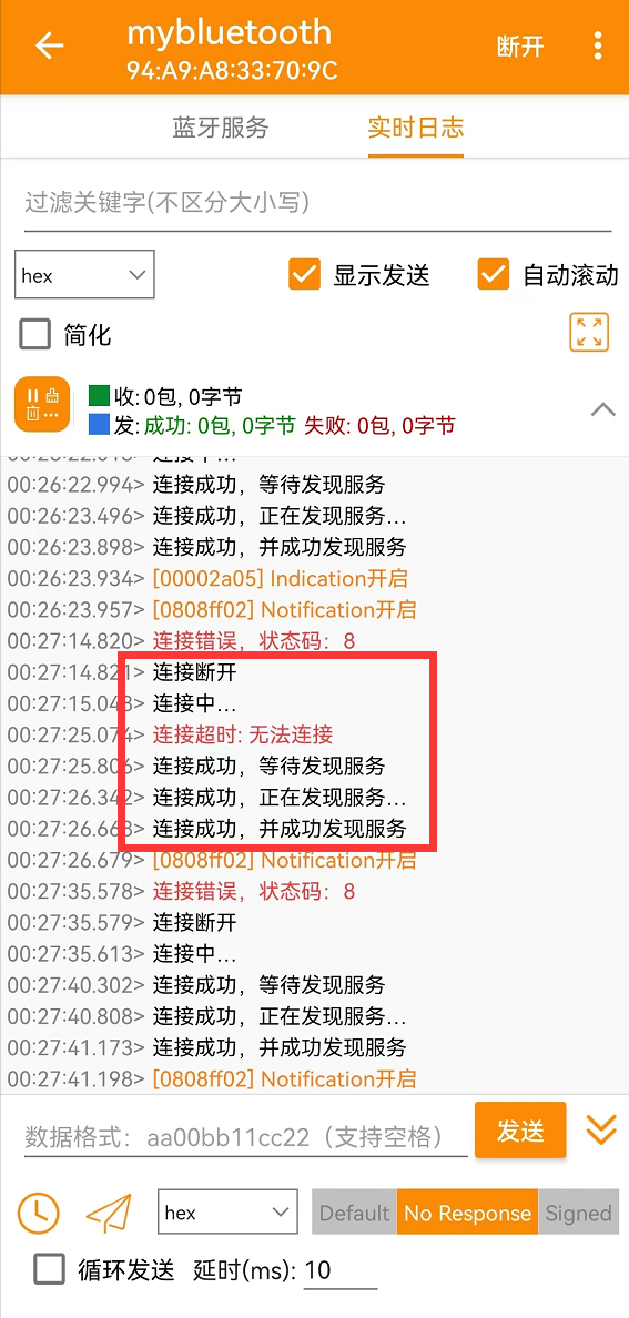 连上之后,就会看到几个蓝牙服务,实时日志里也会看到连接状态的提示;使用蓝牙对外提供服务的设备,需要有对应的服务功能。蓝牙服务分为服务、特性、属性三个部分: