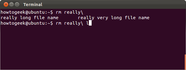 当然,如果当前目录中你有很多以字母r开头的文件,Bash就会不知道你指的是哪一个。比如当前目录你有另一个名字叫做“really very long file name”的文,当你按Tab键时,Bash会补全到“really\”部分,因为两个文件都是以这开头的。然后,再按Tab键你会看到所有能匹配该开头的文件列表,如下图。