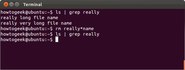星号”*”是一个可以匹配任何东西的通配符。比如,如果我们想把”really long file name“和”really very long file name“从当前目录都删了,我们可以使用如下命令: