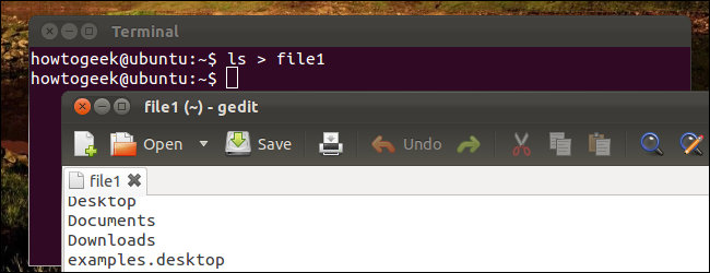 “〉”字符可以把一个命令的输出结果重定向到一个文件,而不需要额外使用另一个命令。比如,下图的代码使用”ls”命令来列出当前目录的所有文件,并把输出的列表输入到了一个名为”file1“的文件,而不是仅仅输出显示在终端上。