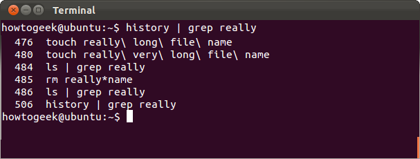 Bash会记得你使用过的命令的历史。你可以使用向上键和向下键来翻阅你已经使用过的命令。使用”history”命令会把历史命令都打印出来,因此你可以使用管道命令来搜索你最近使用的命令。