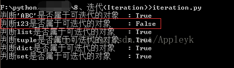 当然,我们也可以判断其他对象,比如说,一个int类型的数字是否是可迭代的,我们也可以乘此机会验证下,我们学过的集合是不是都属于可迭代的对象,下面,我们看下执行结果: