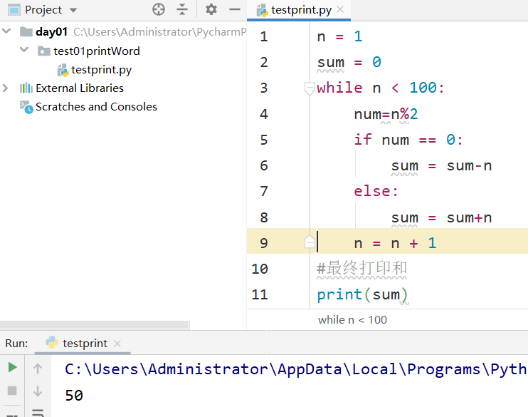 #定义变量n等于1 n = 1 #设最后结果为sum sum = 0 #循环100次以内,因为是1~99的算术值。 while n < 100: #判断对2取余的值,0为偶数,1为奇数 num=n%2 #值是0位偶数,如题2和4前面是减号,所以要减掉偶数变量。 if num == 0: sum = sum-n #不是0就是1,所以直接用else即可,使用加奇数 else: sum = sum+n #每循环一次,自加1 n = n + 1 #最终打印和 print(sum)