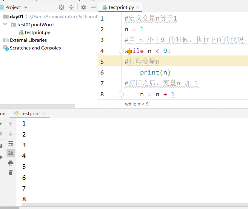 #定义变量n等于1 n = 1 #当 n 小于9 的时候,执行下面的代码。 while n < 9: #打印变量n print(n) #打印之后,变量n 加 1 n = n + 1