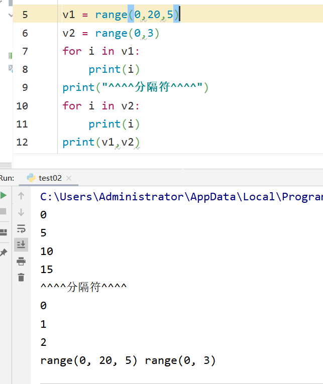 #!/usr/bin/env python # -*- coding:utf-8 -*- # author chensi v1 = range(0,20,5) v2 = range(0,3) for i in v1: print(i) print("^^^^分隔符^^^^") for i in v2: print(i) print(v1,v2)