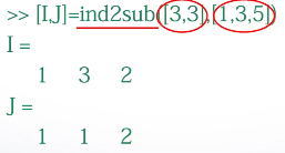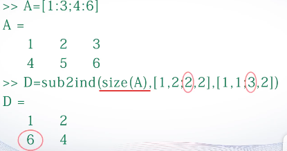 sub2ind函数:将指定的行列下标转换为序号。D=sub2ind(S,I,J) S 行数和列数组成的向量