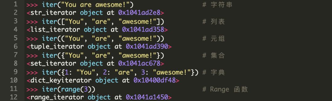 Python 中,一个 iterable 对象指在 for 循环中可以被迭代的任意对象。这意味着,当这个对象作为参数传递给 iter()方法时应该返回一个迭代器。我们来看一下 Python 中的一些常用的内置迭代的例子。