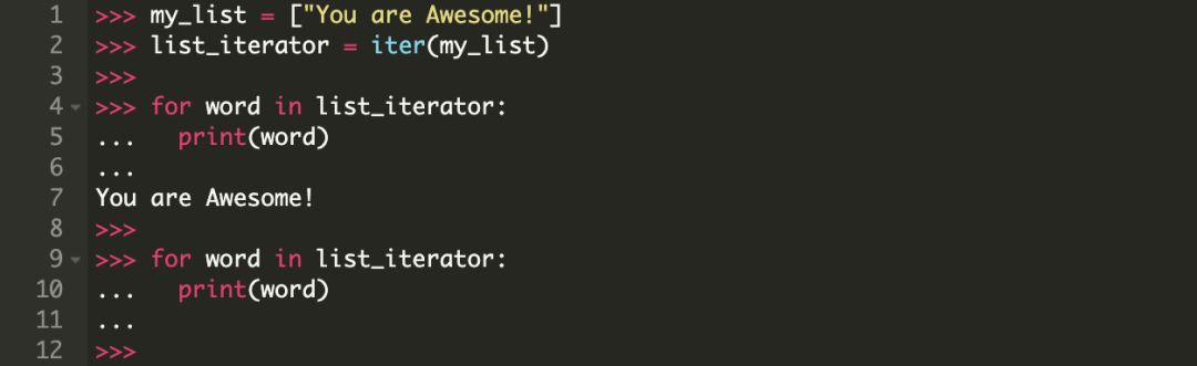1. 在 for 语句内部对列表 ["You", "are", "awesome!"] 调用了 iter() 方法,返回结果是一个迭代器。