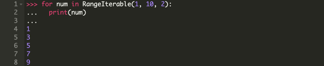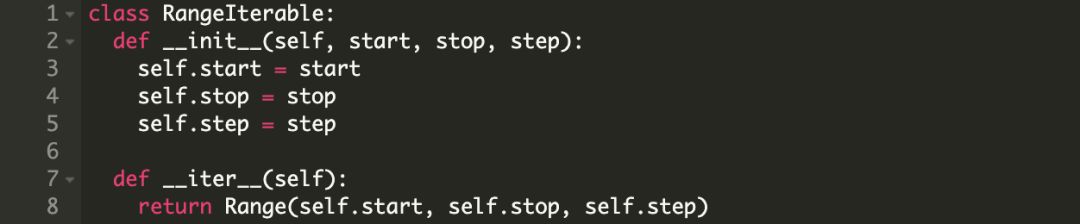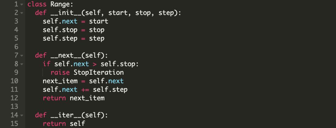 现在我们已经知道迭代协议的原理,可以写一个自己的迭代器了。我们先看一个例子,下面我们创建了一个根据给定范围和步长的 Range 类。