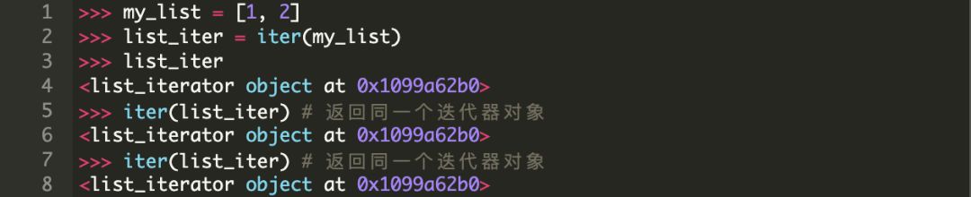 有一个很有趣的事需要记一下,迭代器同样支持(强制要求支持迭代器协议)iter() 方法。这意味着我们可以对一个迭代器调用iter() 方法并获取它自身的迭代器对象。