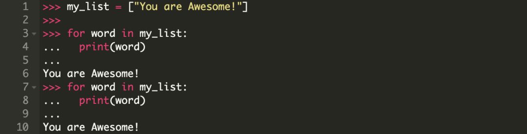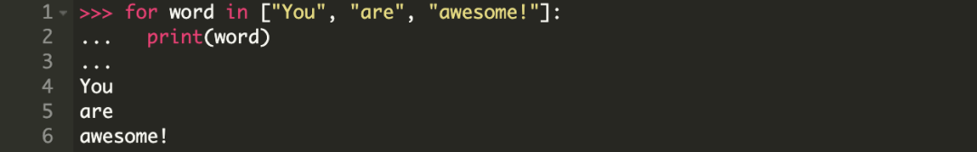 1. 第 1 行,即,"for word in [“You”, “are”, “awesome!”]:" 转译为: