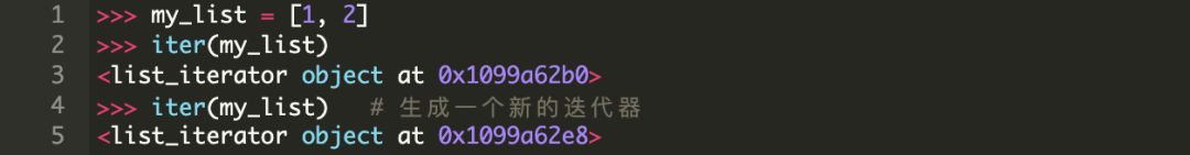 然而要注意一点,在像 list 这样的容器对象上调用 iter() 每次都会返回不同的迭代器,而在迭代器上调用 iter() 仅仅返回同一个迭代器。