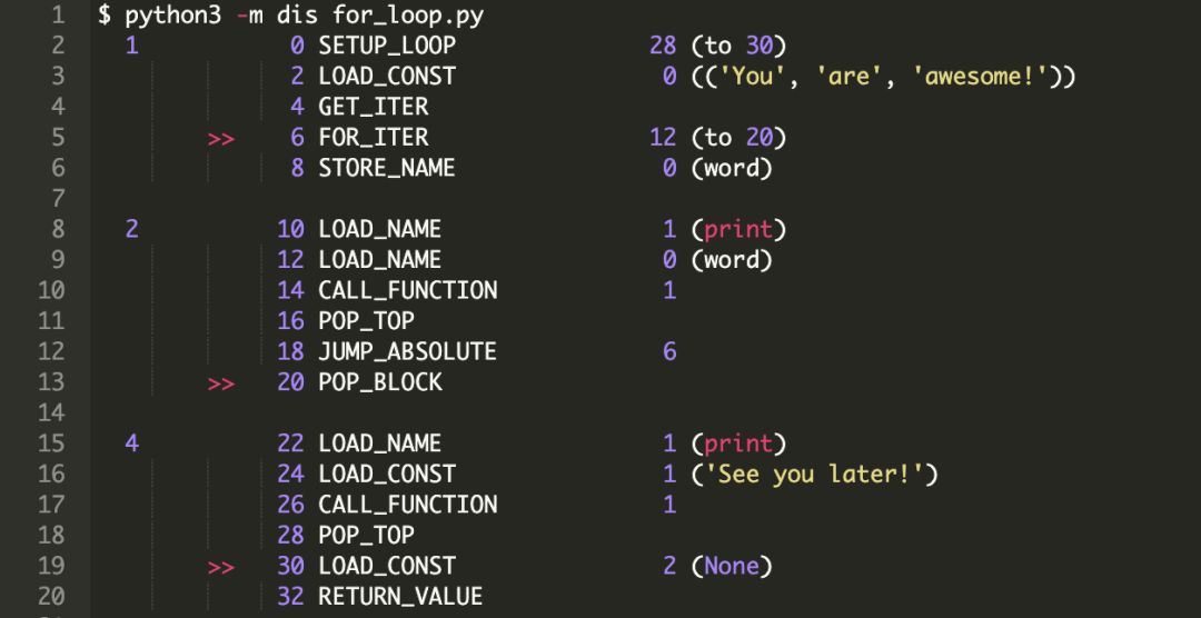 注意,一旦迭代器中的元素都遍历结束,指令 "6 FOR_ITER" 会结束循环并跳转到 "20 POP_BLOCK"。