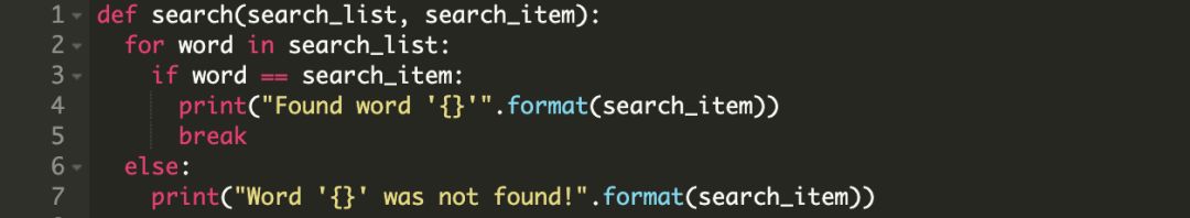 而用 else 代码块的话,我们可以避免使用布尔类型的标记found_item。我们看看如何使用 else 子句重写上面的方法。注意如果 for 循环中的 break 语句被触发执行,那么则会跳过 else 块。
