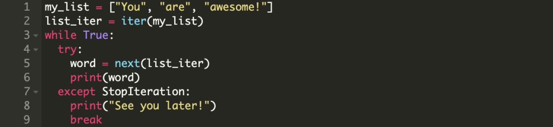 那么什么是迭代器呢?迭代器在 Python 中被定义为一个表现为流式数据的对象。基本上,如果我们将对象传递给内置的next() 方法,它应该从与之关联的流式数据中返回下一个值。一旦所有的元素都遍历结束,它会抛出一个*StopIteration* 异常。next()方法的后续调用也都会抛出*StopIteration* 异常。