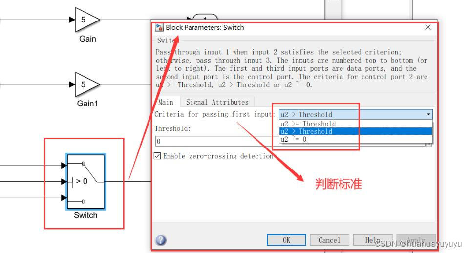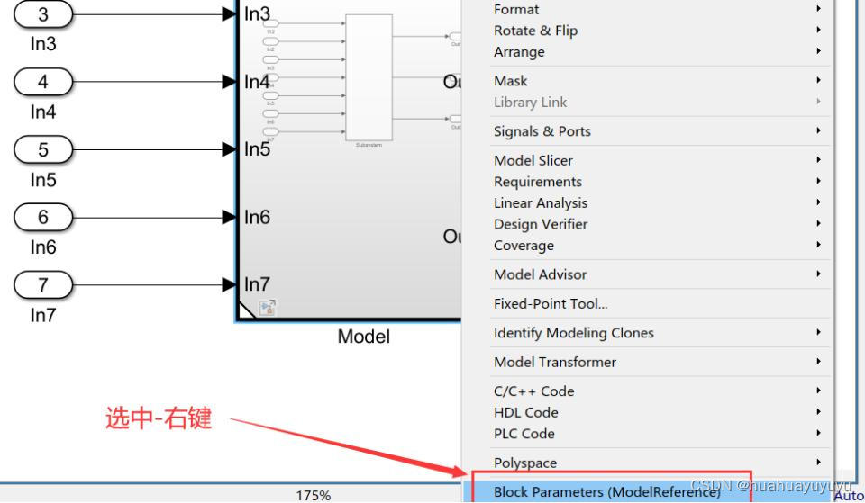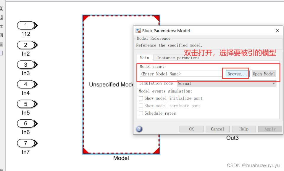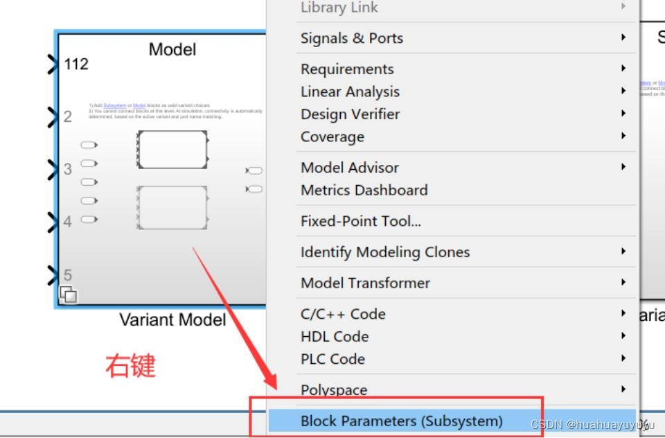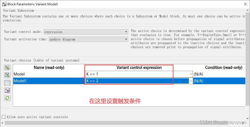 这里相当于一个swish模块,当满足条件后模块执行上边那个(Model),否则执行下面那个(Model1),我们可以右键Variant Mode块图来设置条件