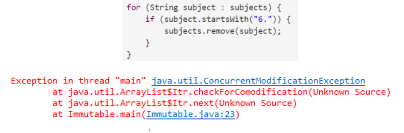 Iterator iter = subjects.iterator(); while(iter.hasNext()){ subject = iter.next(); if(subject.startsWith("6.")){ subjects.remove(subject);//仅将iter.remove()更改为subjects.remove(subject) } }
