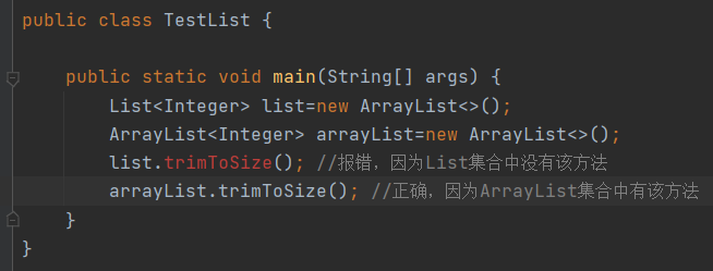 - List list = new ArrayList(); 这句创建了一个 ArrayList 的对象后赋给了List,此时它是一个 List 对象了,有些 ArrayList 中存在的方法 但是 List 就没有这样的属性和方法了,它就不能再用了。