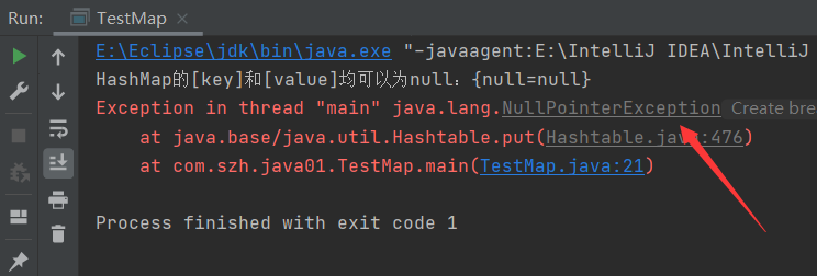此时将Hashtable中的key或者value设置为 null,可以正常的被try/catch语句块捕捉。