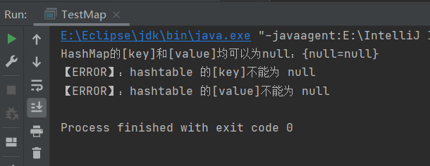输出结果中,HashMap可以正常输出,而Hashtable则是报了空指针异常 。